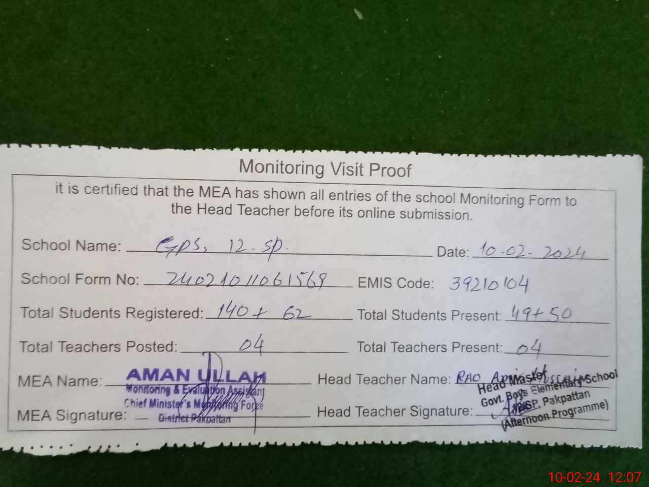 | EMIS Code: 39210104 | Name of School: GPS 12/SP P.O 8.S.P PAKPATTAN | |||