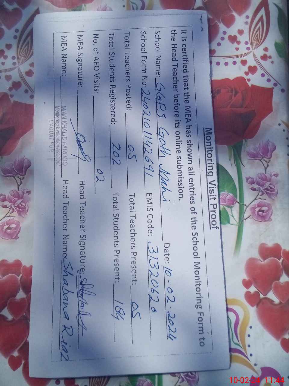 | EMIS Code: 31320620 | Name of School: GGPS GOTH MAHI | |||