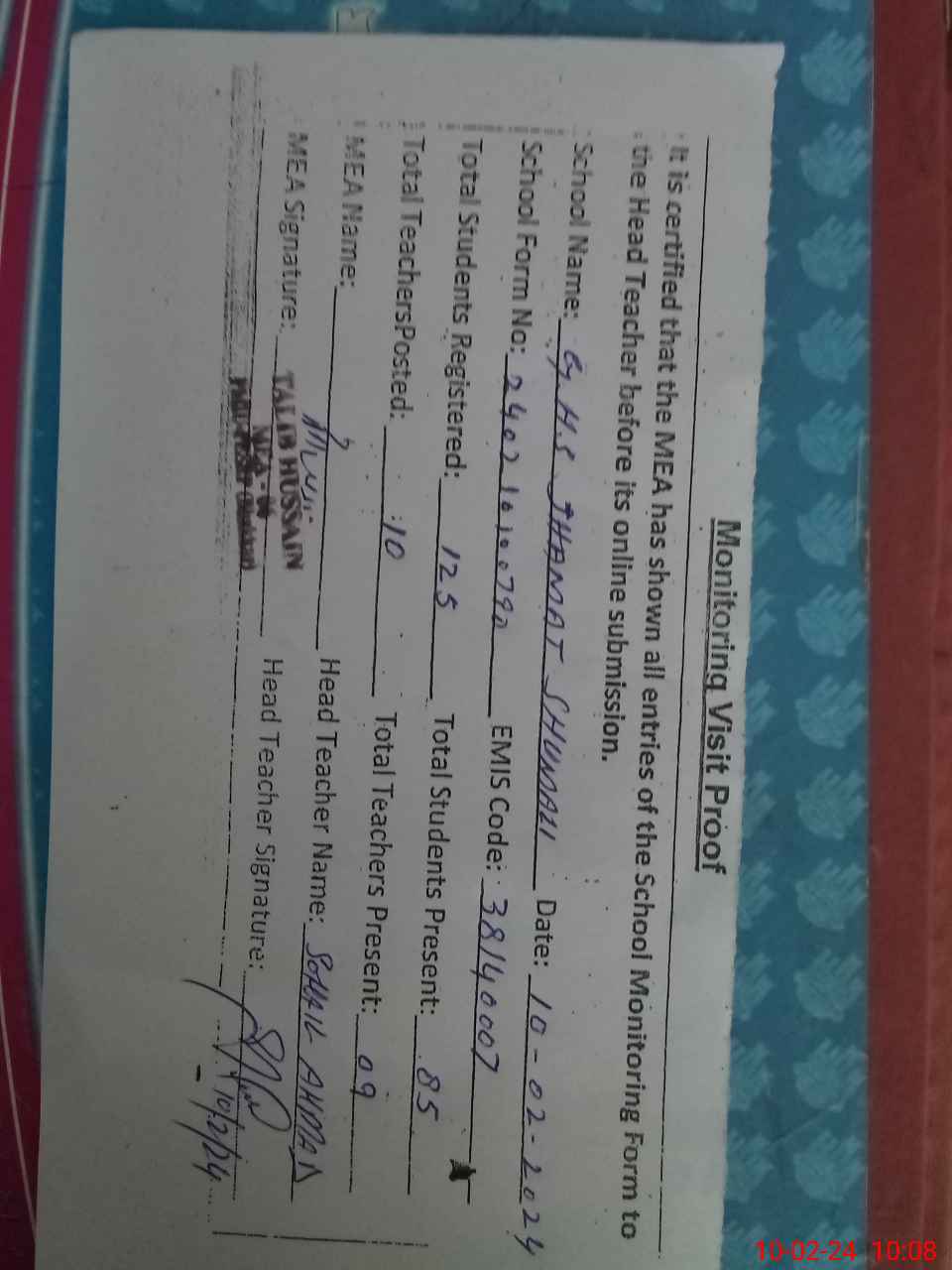 | Certified that this School was Inspected by the Undersigned MEA/DMO Today and the Information Stated Above is as Per Record. | |||||