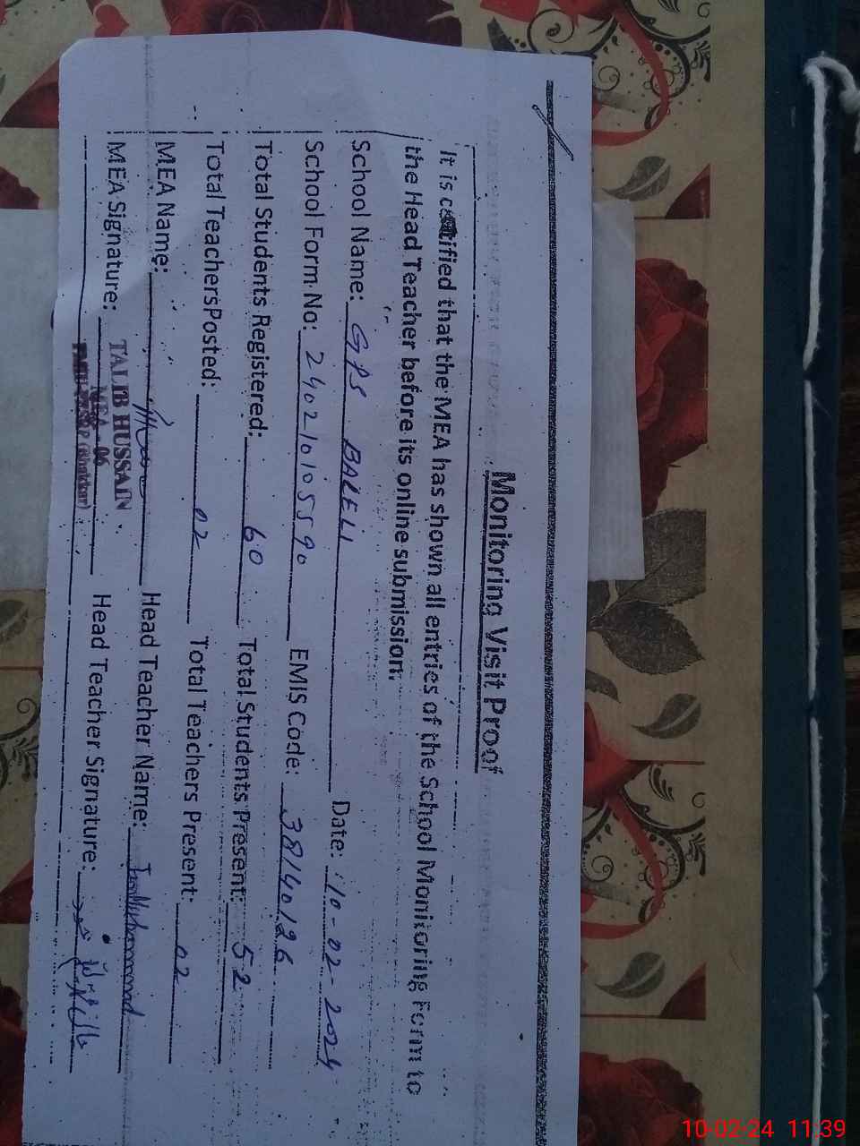 | Certified that this School was Inspected by the Undersigned MEA/DMO Today and the Information Stated Above is as Per Record. | |||||