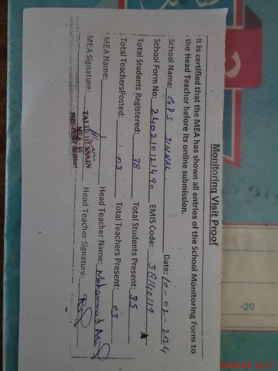 | Attendance Register | Head Teacher | MEA with School | Visit Proof |