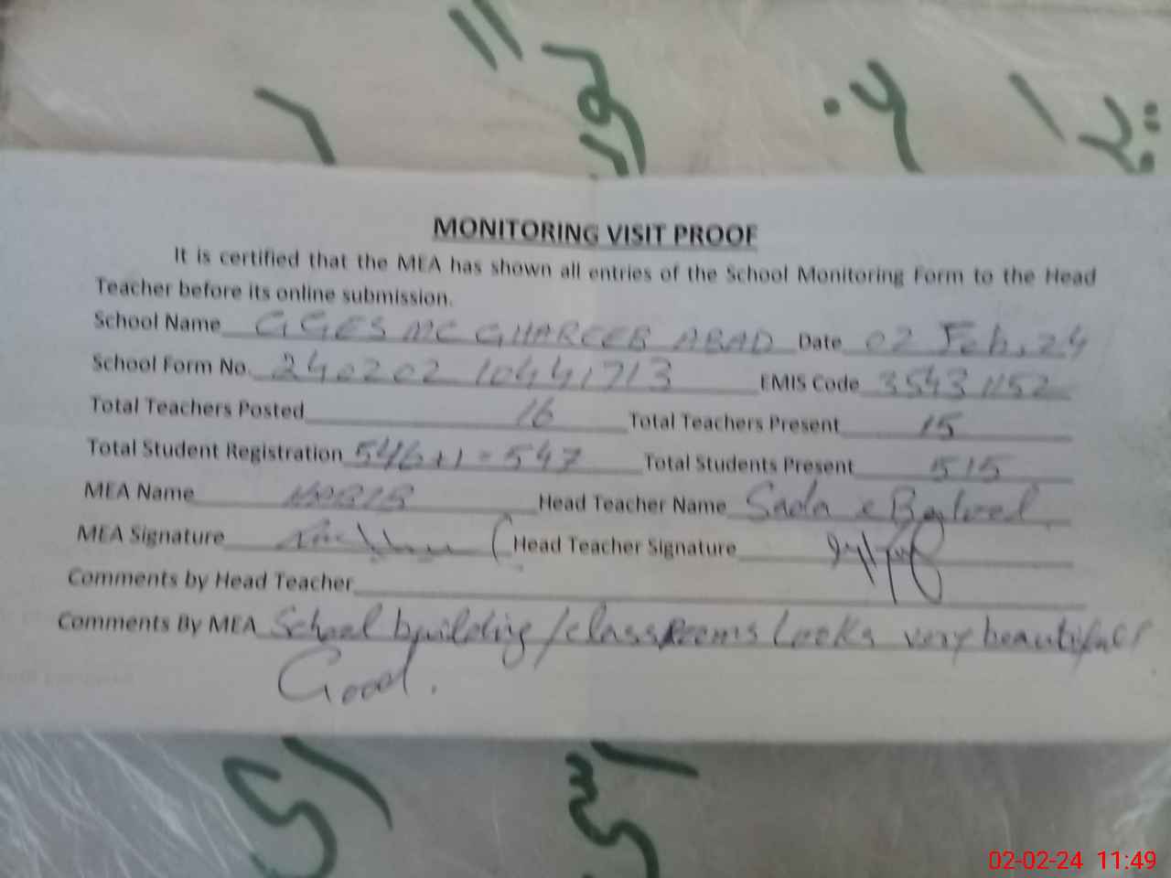 | Certified that this School was Inspected by the Undersigned MEA/DMO Today and the Information Stated Above is as Per Record. | |||||
