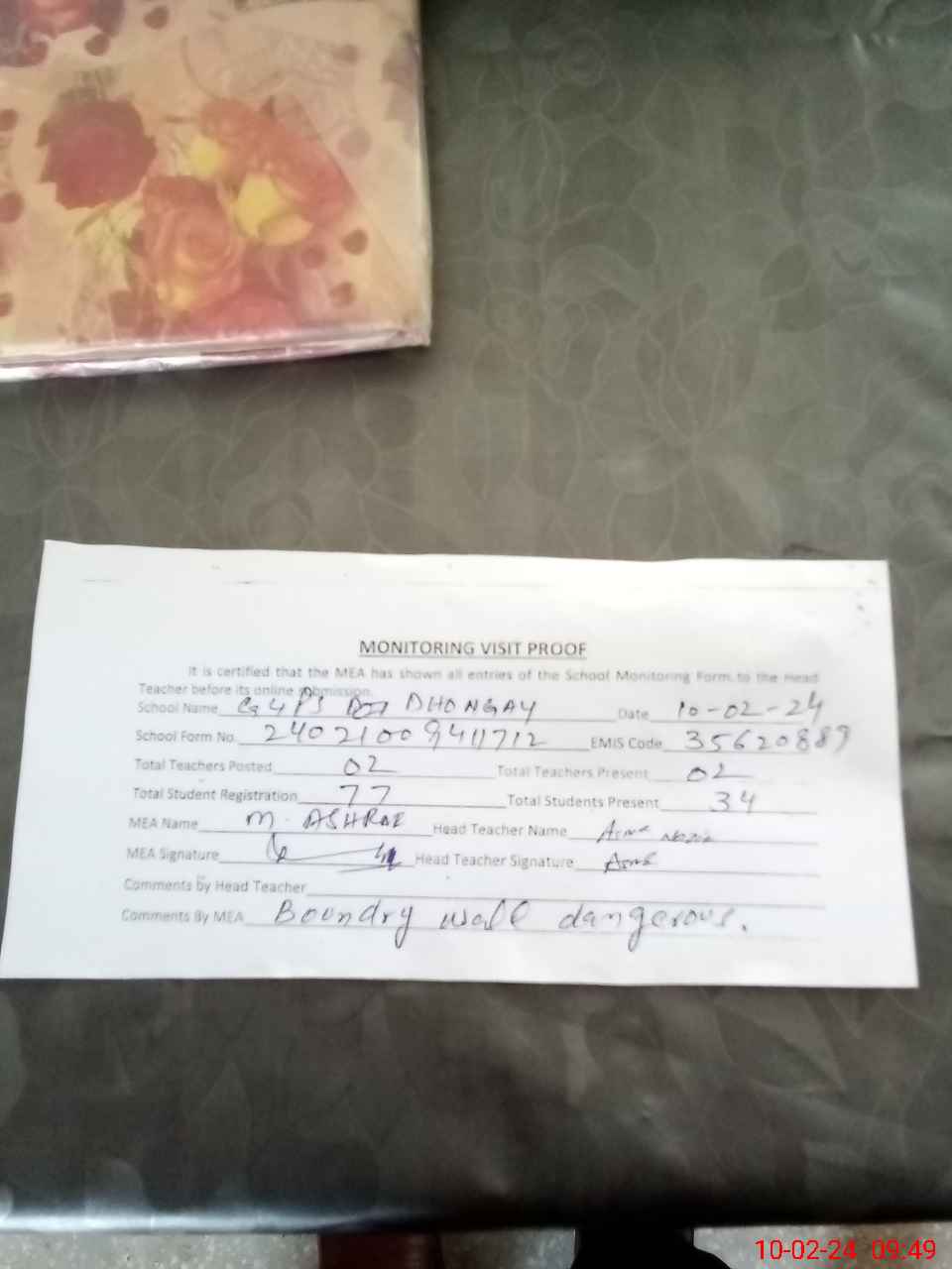 | Certified that this School was Inspected by the Undersigned MEA/DMO Today and the Information Stated Above is as Per Record. | |||||