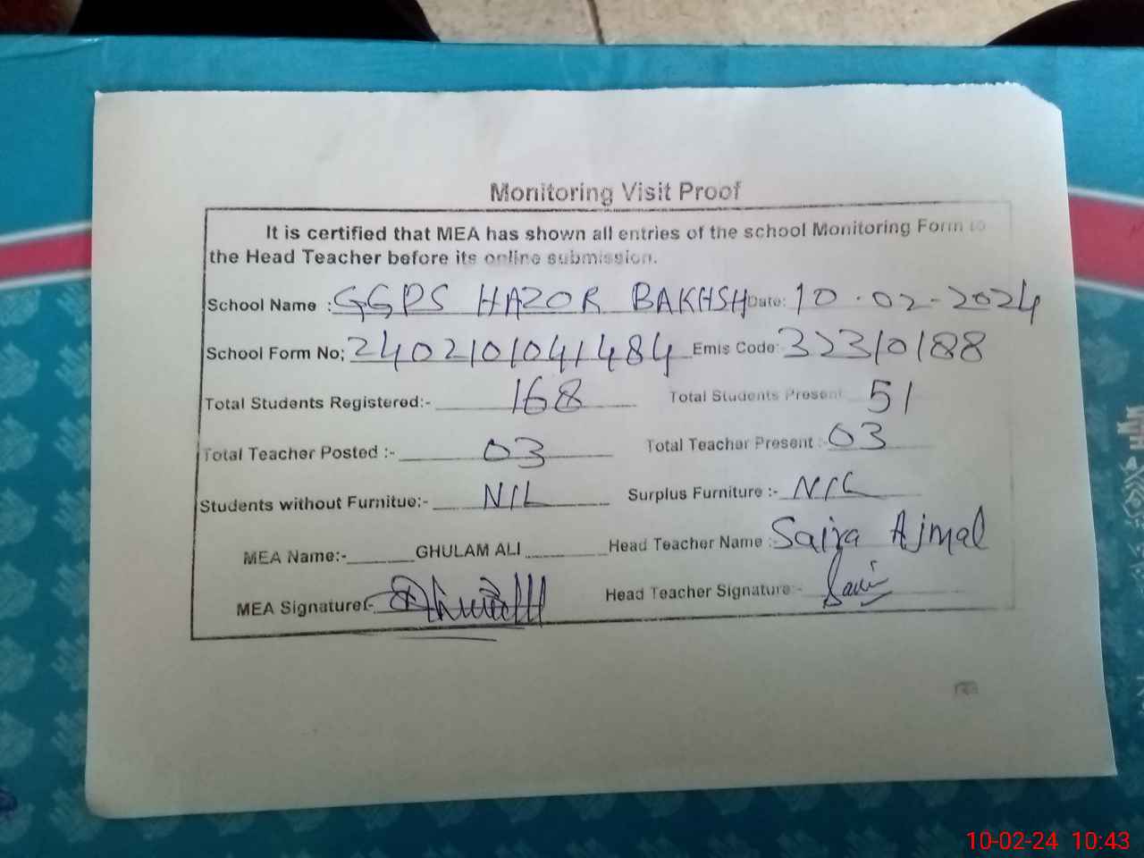 | EMIS Code: 32310188 | Name of School: GGPS HAZOOR BAKHSH | |||