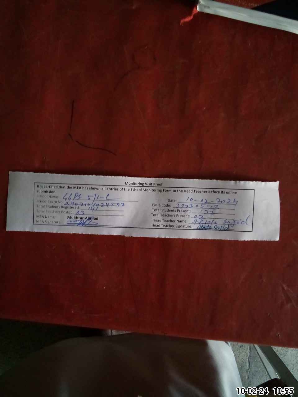 | Attendance Register | Head Teacher | MEA with School | Visit Proof |