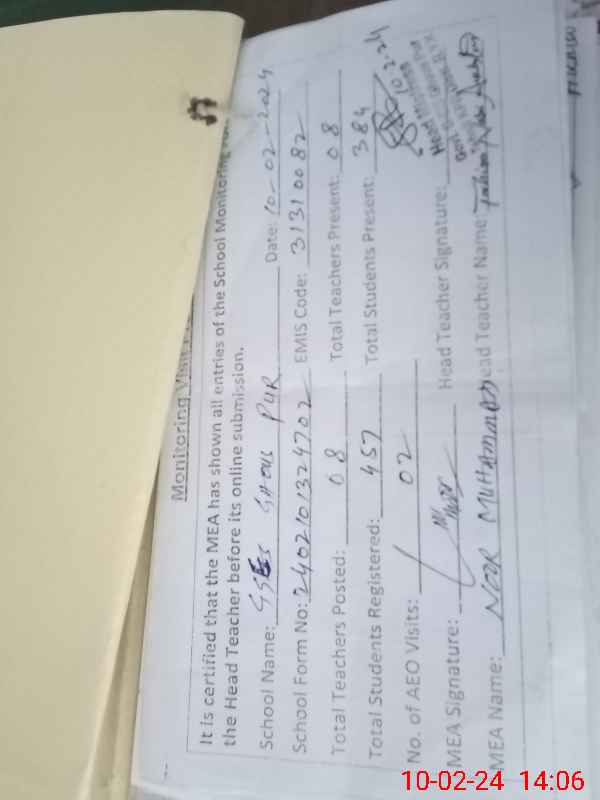 | Certified that this School was Inspected by the Undersigned MEA/DMO Today and the Information Stated Above is as Per Record. | |||||