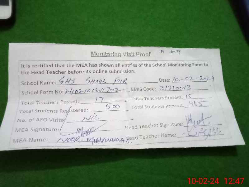 | Certified that this School was Inspected by the Undersigned MEA/DMO Today and the Information Stated Above is as Per Record. | |||||