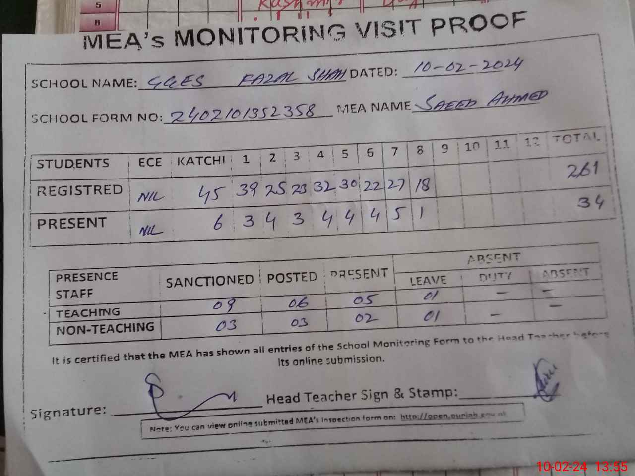 | Certified that this School was Inspected by the Undersigned MEA/DMO Today and the Information Stated Above is as Per Record. | |||||