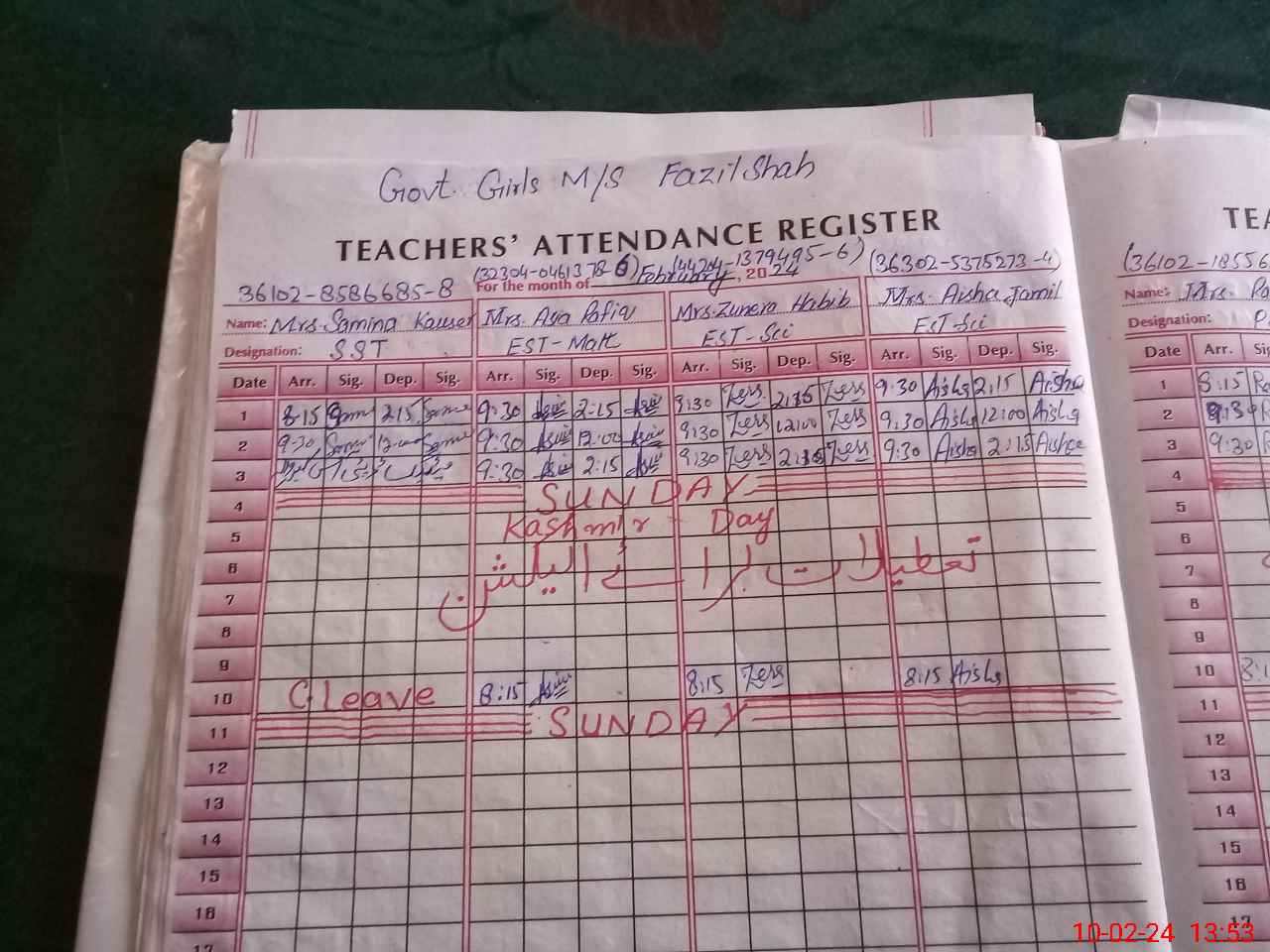 | Name: Zu**** Ha**** Designation: (School Headmaster's/Headmistress's) EST SCIENCE Phone/Cell Number: 03**** |