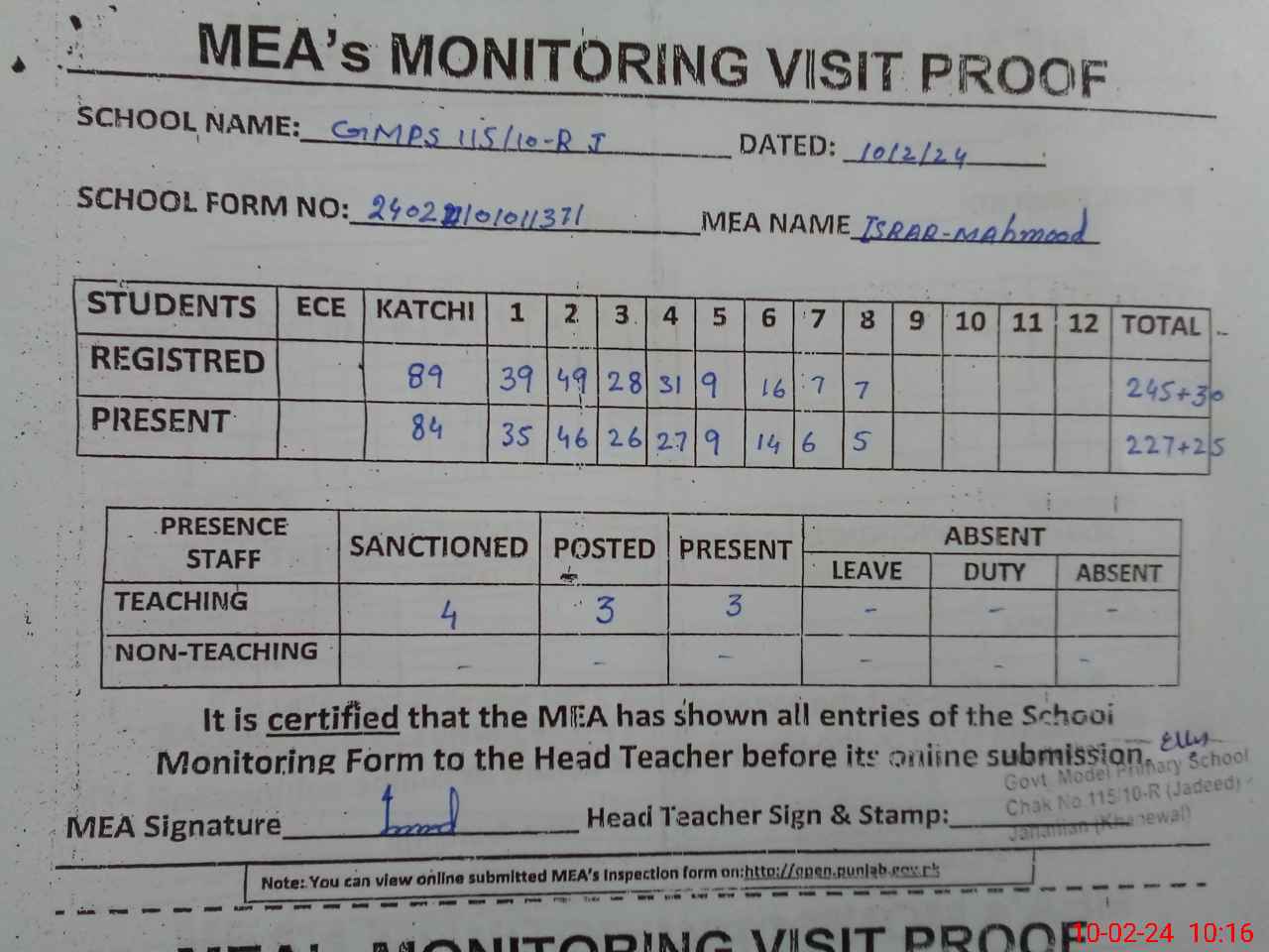| Certified that this School was Inspected by the Undersigned MEA/DMO Today and the Information Stated Above is as Per Record. | |||||