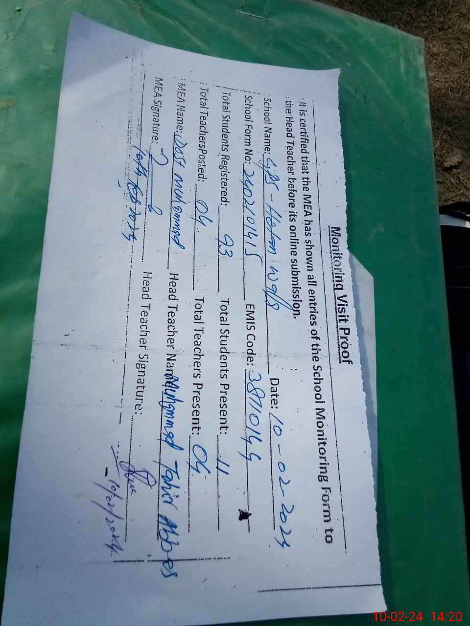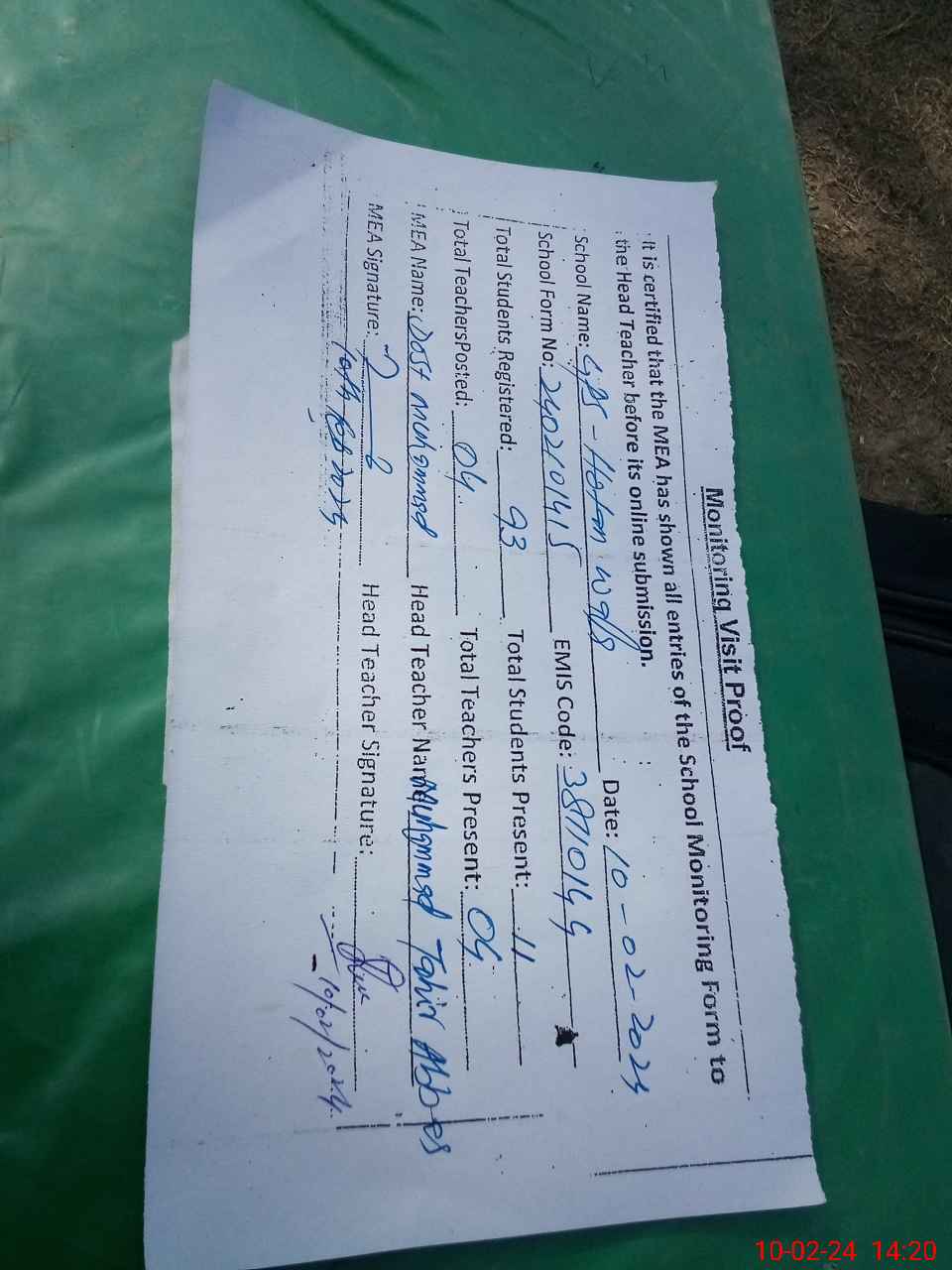 | Attendance Register | Head Teacher | MEA with School | Visit Proof |