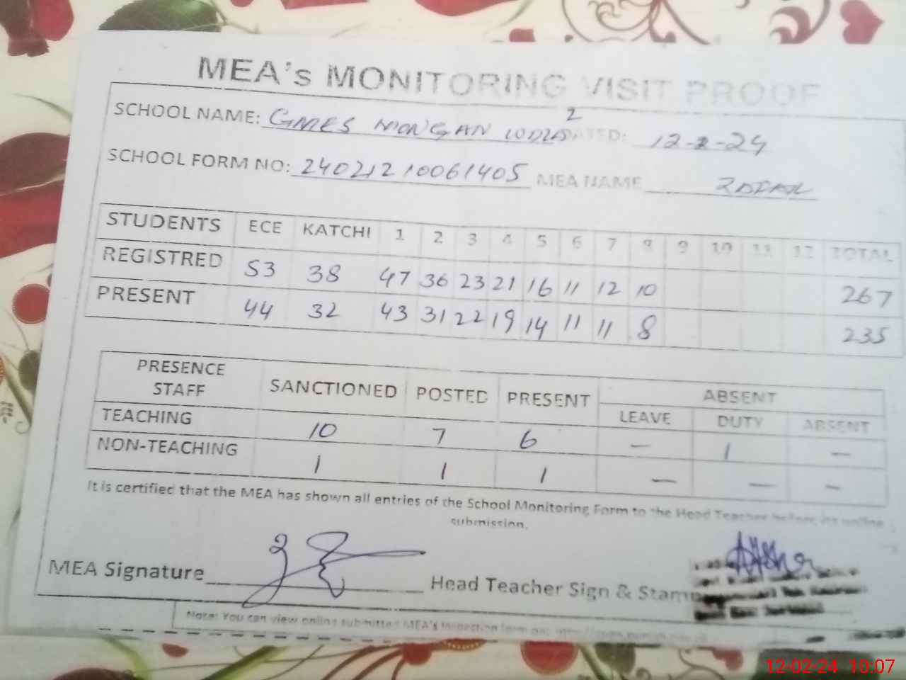 | Certified that this School was Inspected by the Undersigned MEA/DMO Today and the Information Stated Above is as Per Record. | |||||