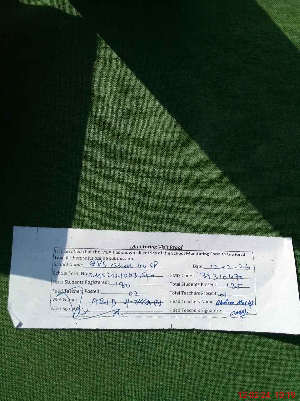 | Attendance Register | Head Teacher | MEA with School | Visit Proof |