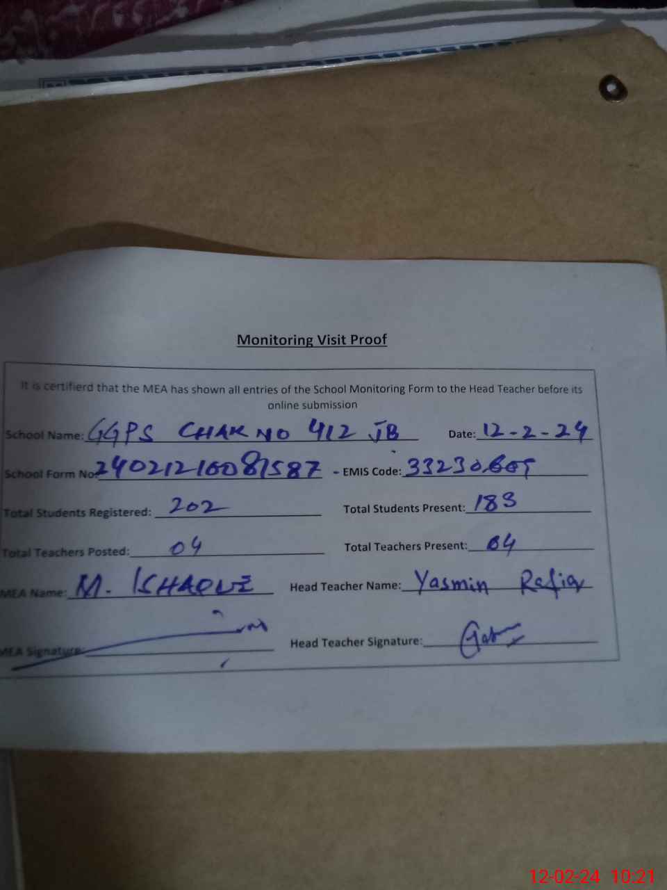 | EMIS Code: 33230609 | Name of School: GGPS CHAK NO 412 JB CHEEMIAN WALA | |||