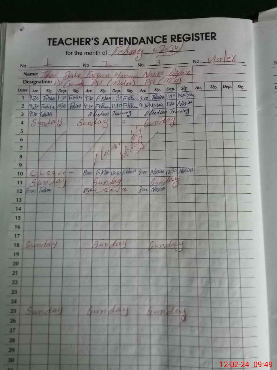 | Total no. of Classrooms: 4 No. of Classrooms Used for Teaching: 4 No. of Classrooms Storing Old Furniture, FTBs, etc: 0Comments if Any: No Admin visit AEO for the month of January 24 |