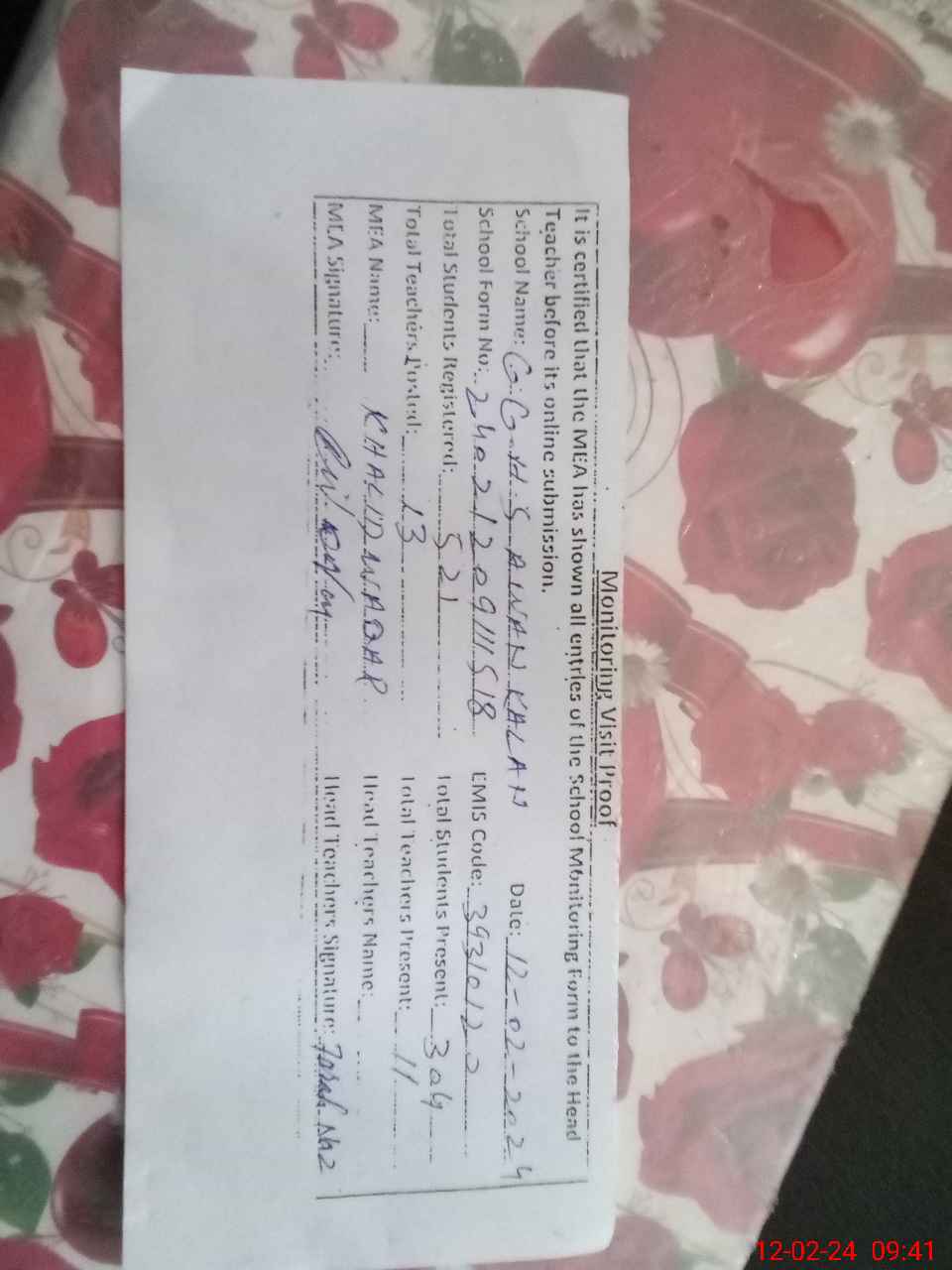 | Certified that this School was Inspected by the Undersigned MEA/DMO Today and the Information Stated Above is as Per Record. | |||||