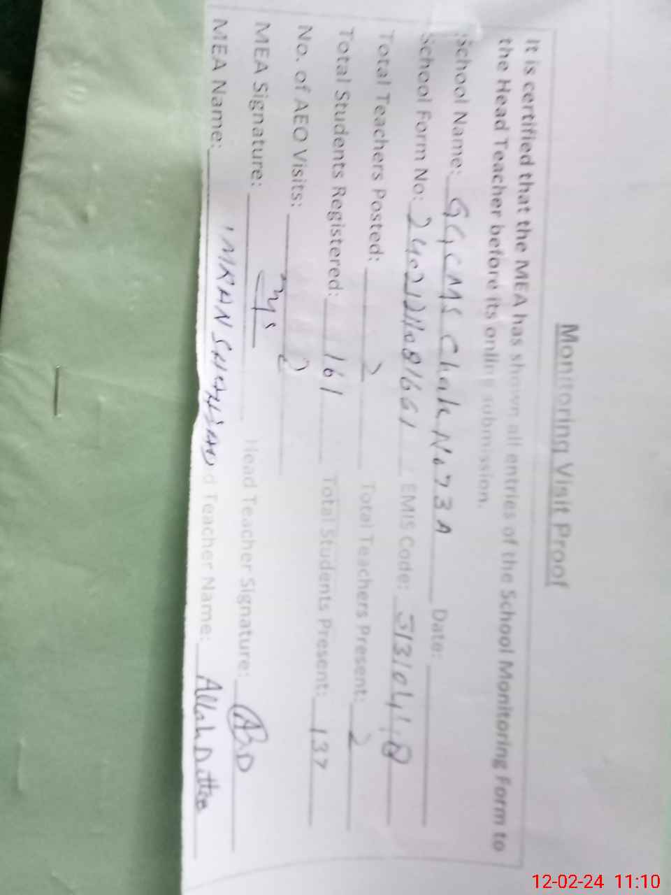 | Attendance Register | Head Teacher | MEA with School | Visit Proof |