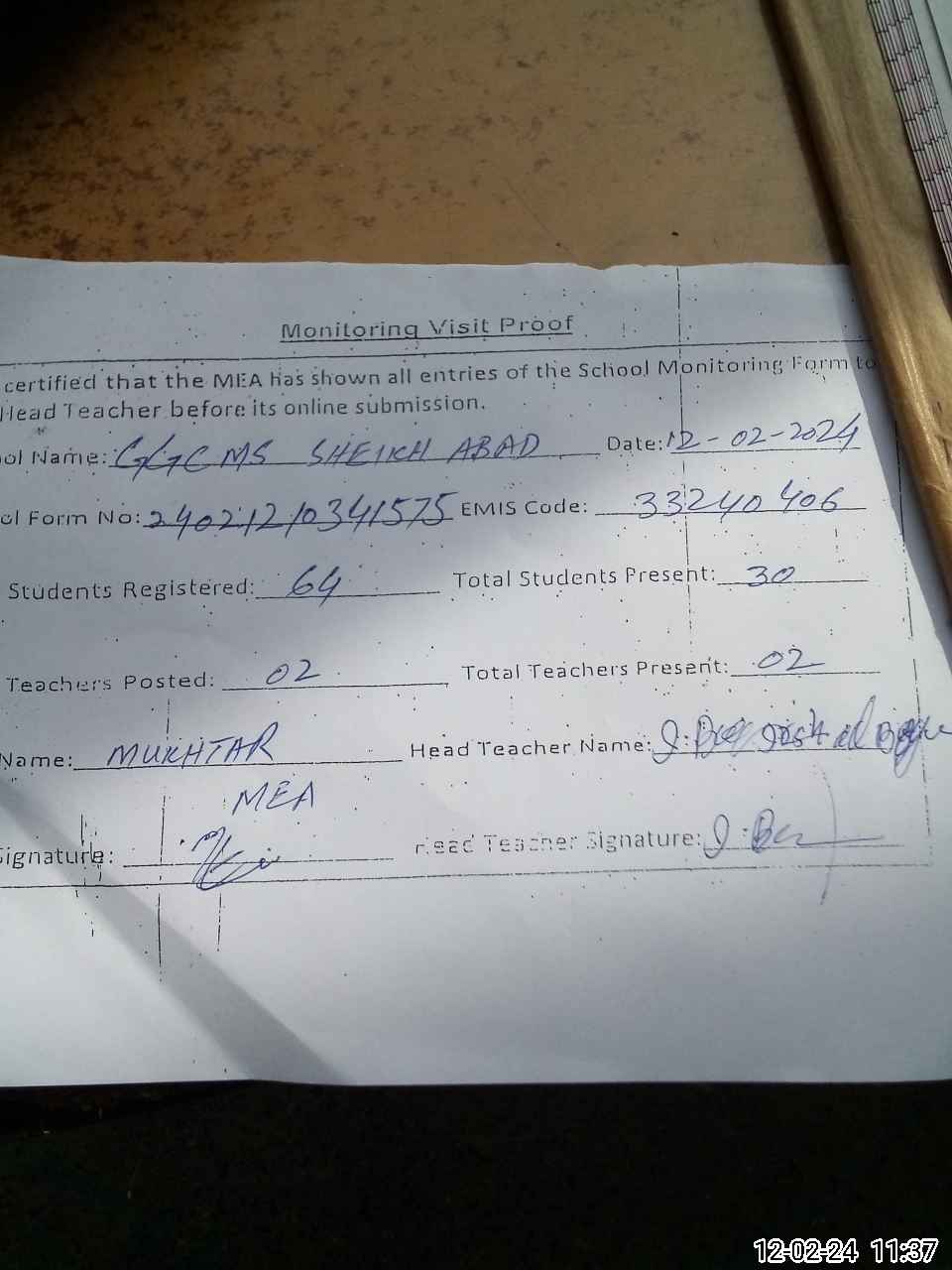 | Attendance Register | Head Teacher | MEA with School | Visit Proof |