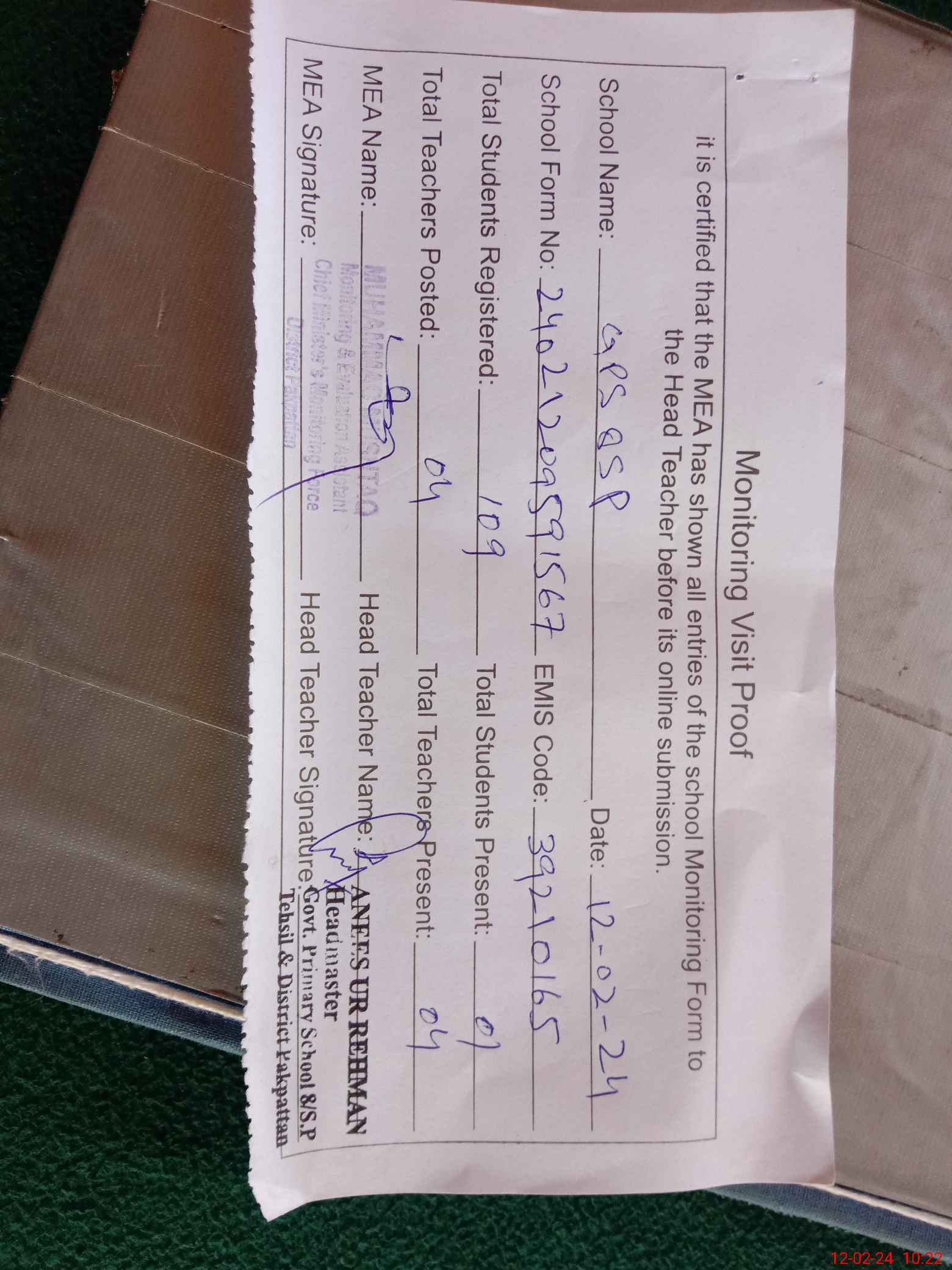 | Attendance Register | Head Teacher | MEA with School | Visit Proof |
