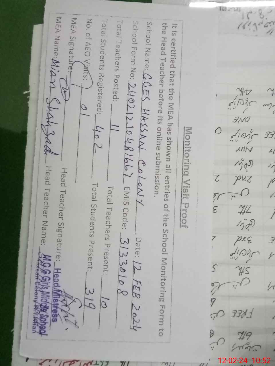 | EMIS Code: 31330108 | Name of School: GGES HASSAN COLONY | |||