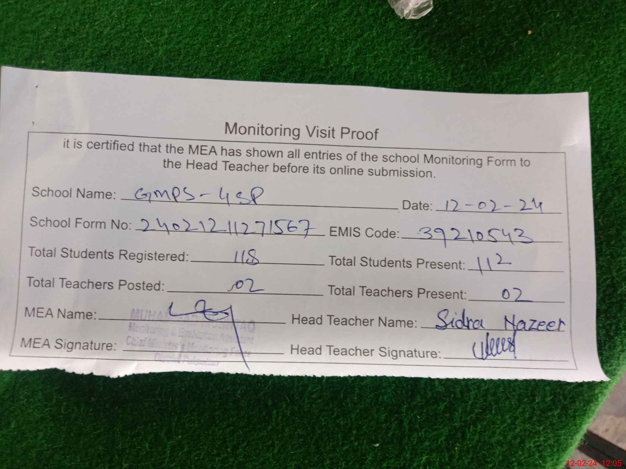 | EMIS Code: 39210543 | Name of School: GMPS CHAK NO. 4/SP | |||