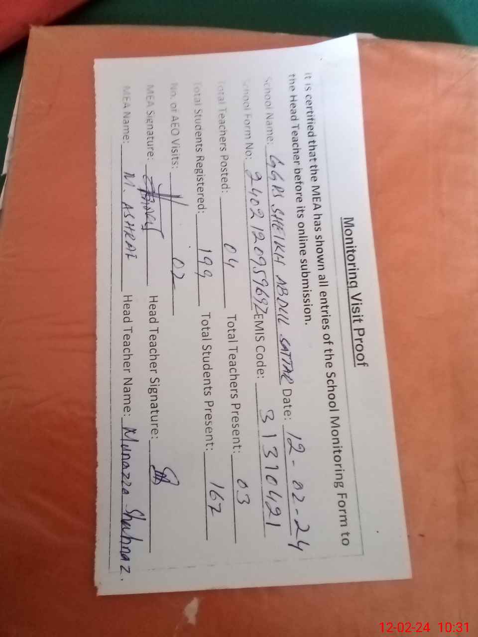 | EMIS Code: 31310421 | Name of School: GGPS SHAIKH ABDUL SATTAR | |||