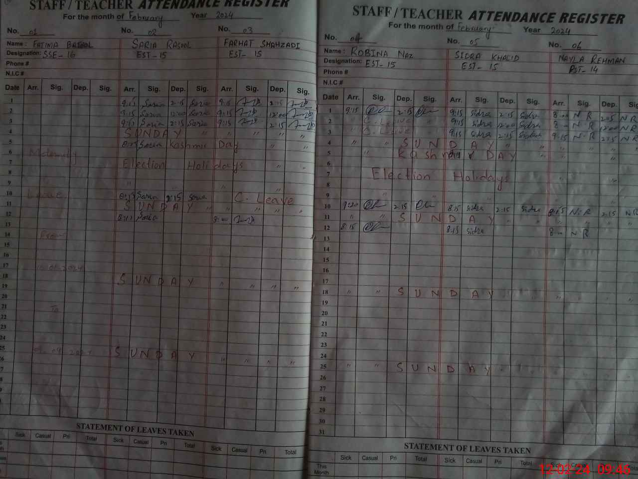 | CNIC | Full Name | Designation | R/C | Absence During Last Calender Month |