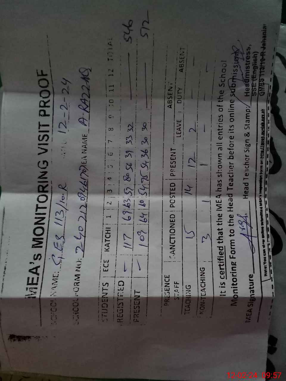 | Attendance Register | Head Teacher | MEA with School | Visit Proof |