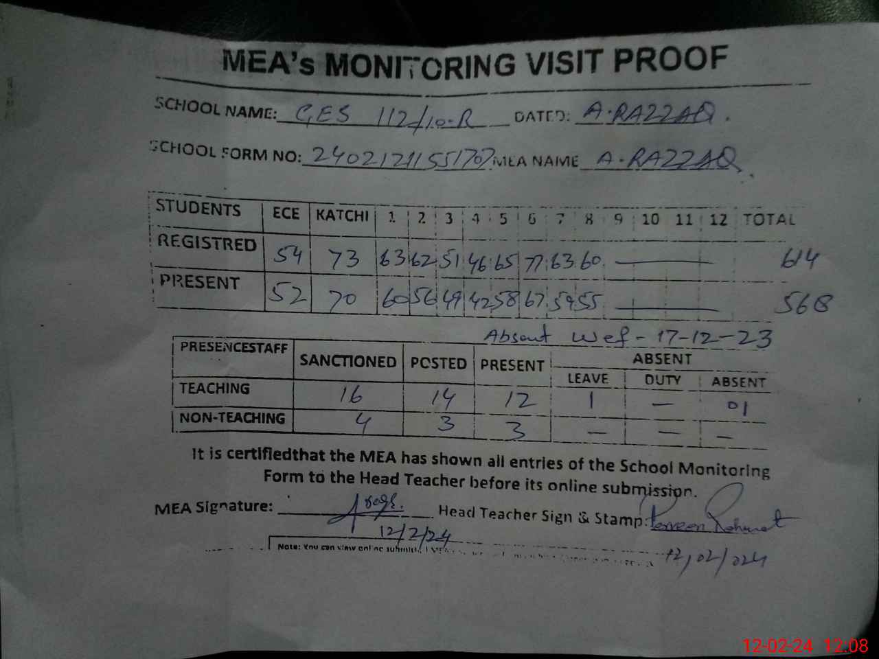 | Attendance Register | Head Teacher | MEA with School | Visit Proof |