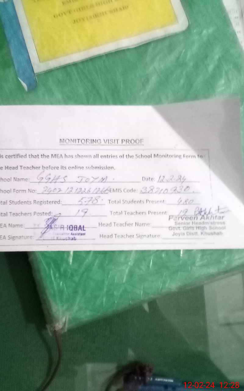 | EMIS Code: 38210930 | Name of School: GGHS JOYIA | |||