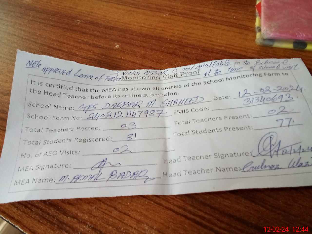 | EMIS Code: 31340693 | Name of School: GPS DARBAR M. SHAHEED | |||