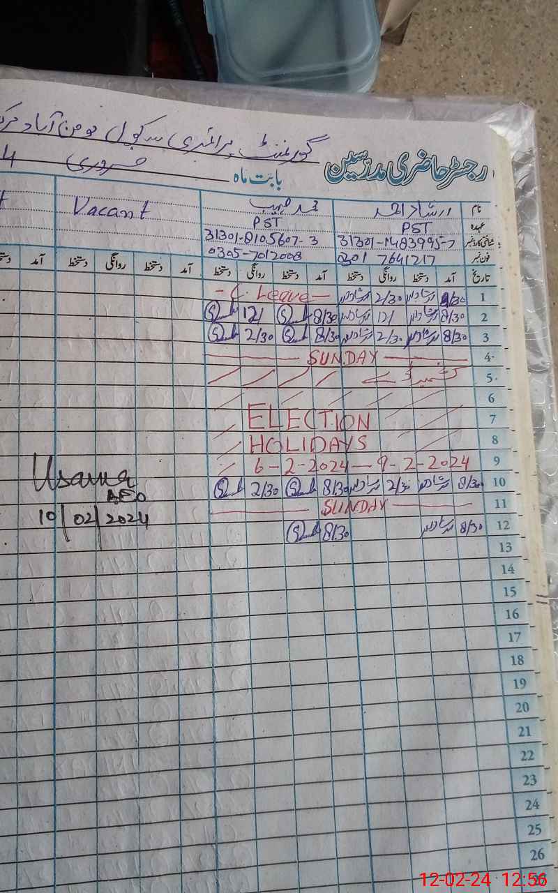 | Name: IR**** AH**** Designation: (School Headmaster's/Headmistress's) PST Phone/Cell Number: 03**** |