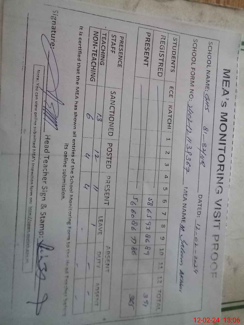 | Attendance Register | Head Teacher | MEA with School | Visit Proof |