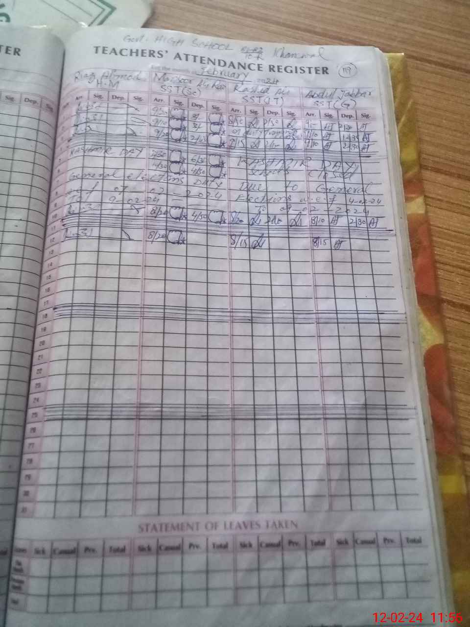 | CNIC | Full Name | Designation | R/C | Absence During Last Calender Month |