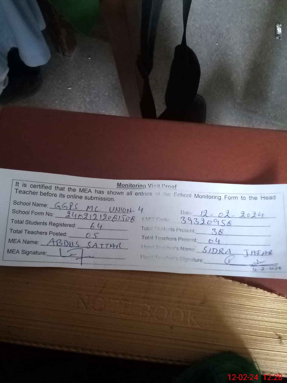 | Attendance Register | Head Teacher | MEA with School | Visit Proof |