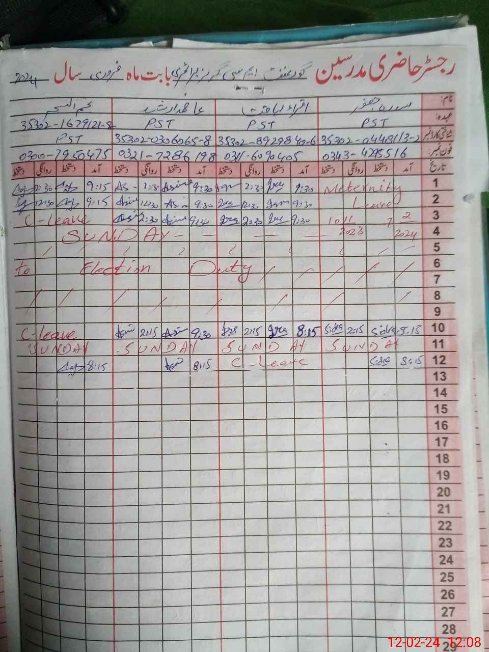 | CNIC | Full Name | Designation | R/C | Absence During Last Calender Month |