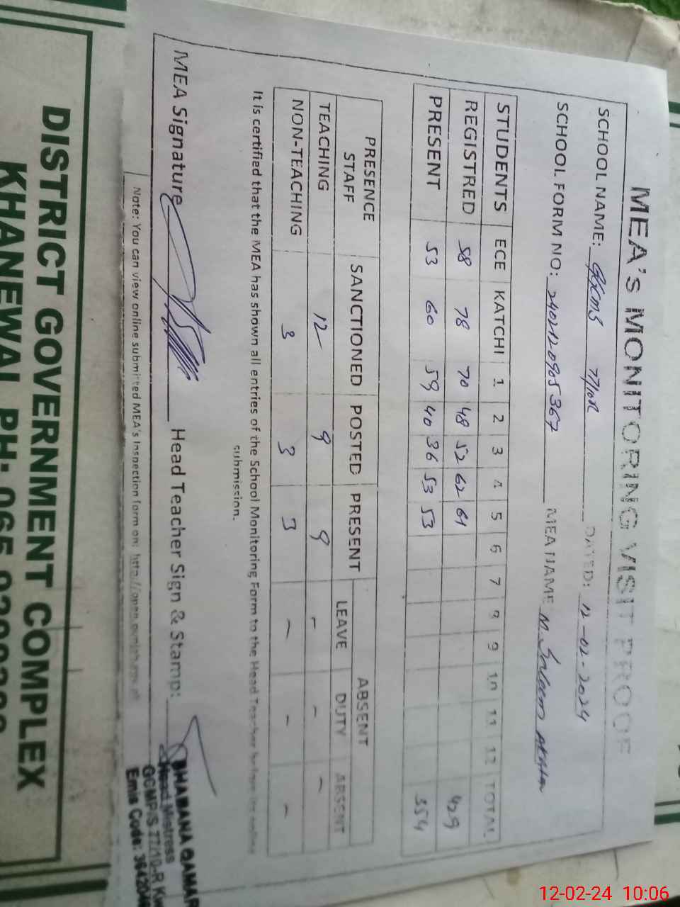 | Certified that this School was Inspected by the Undersigned MEA/DMO Today and the Information Stated Above is as Per Record. | |||||