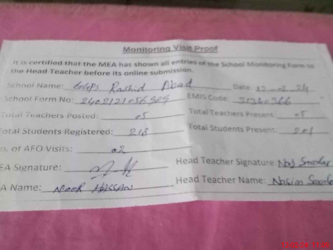 | Attendance Register | Head Teacher | MEA with School | Visit Proof |