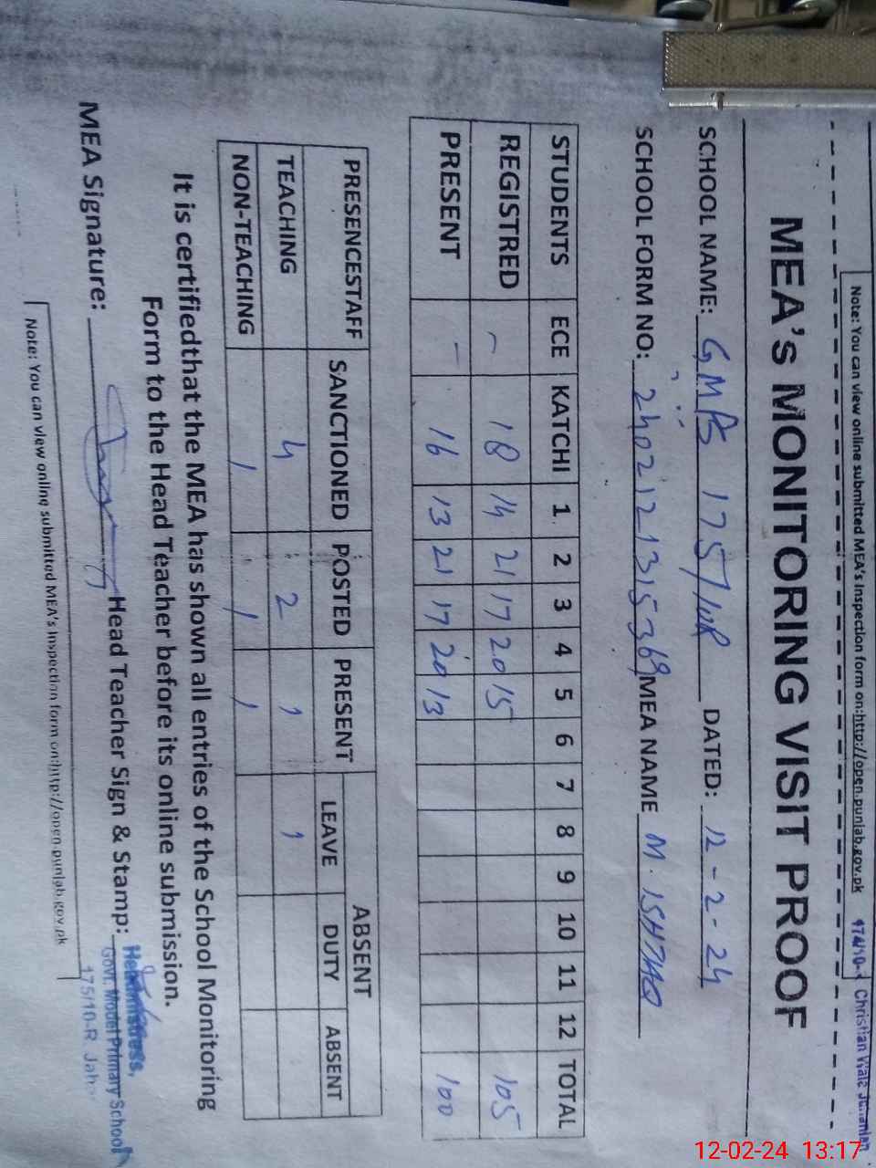 | Certified that this School was Inspected by the Undersigned MEA/DMO Today and the Information Stated Above is as Per Record. | |||||