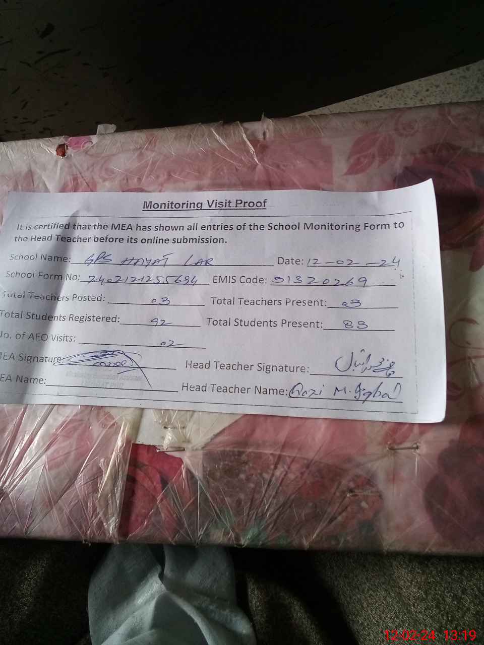 | EMIS Code: 31320269 | Name of School: GPS HAYAT LAR | |||