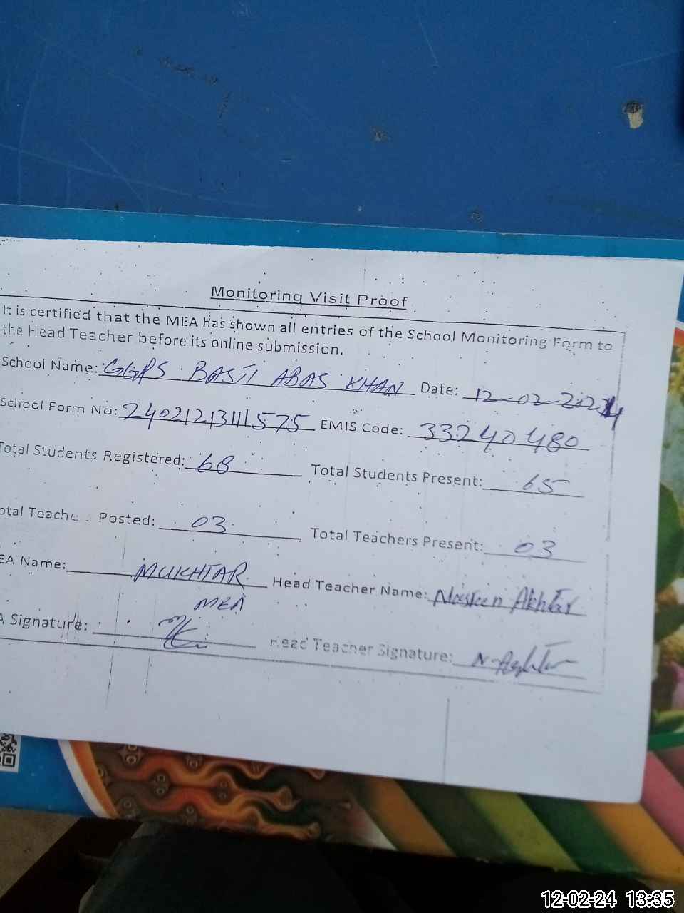 | EMIS Code: 33240480 | Name of School: GGPS BASTI ABBAS KHAN | |||