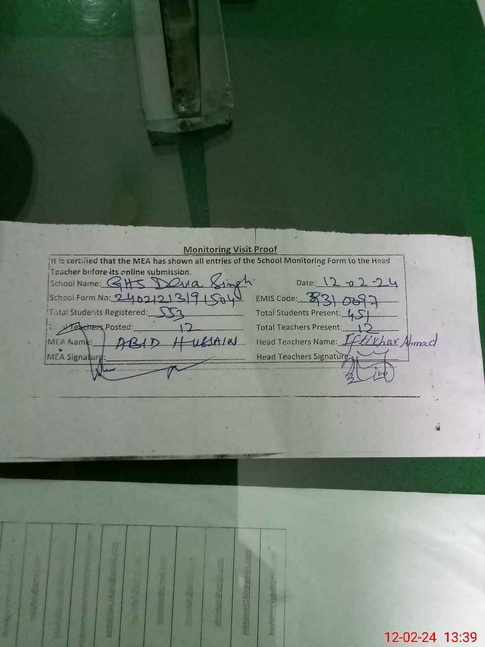 | Certified that this School was Inspected by the Undersigned MEA/DMO Today and the Information Stated Above is as Per Record. | |||||