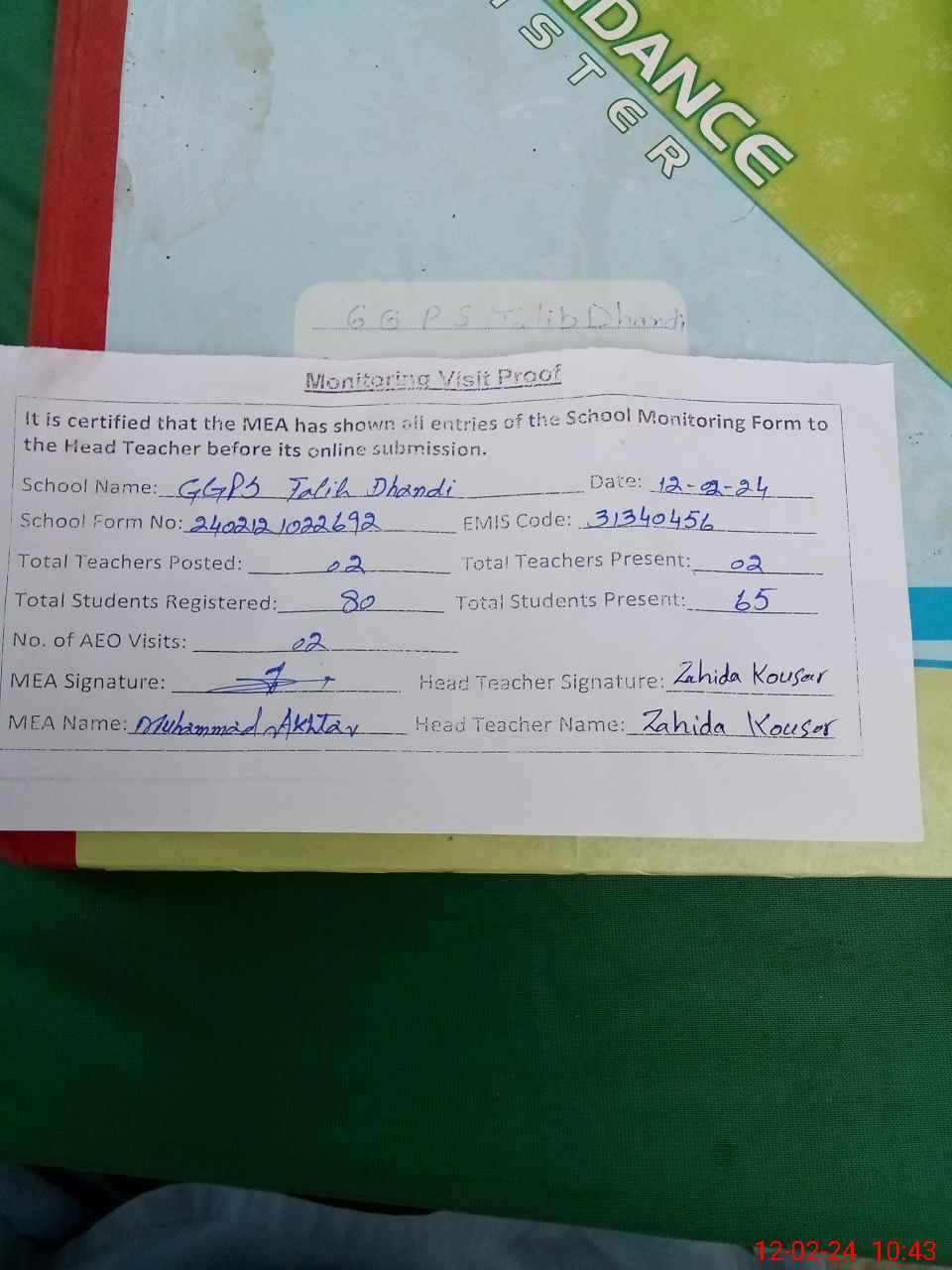 | EMIS Code: 31340456 | Name of School: GGPS TALIB DHANDI | |||