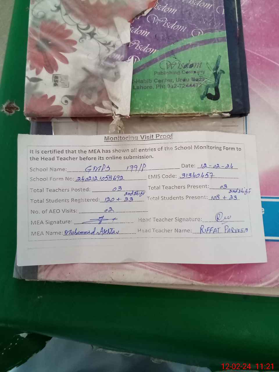 | Attendance Register | Head Teacher | MEA with School | Visit Proof |