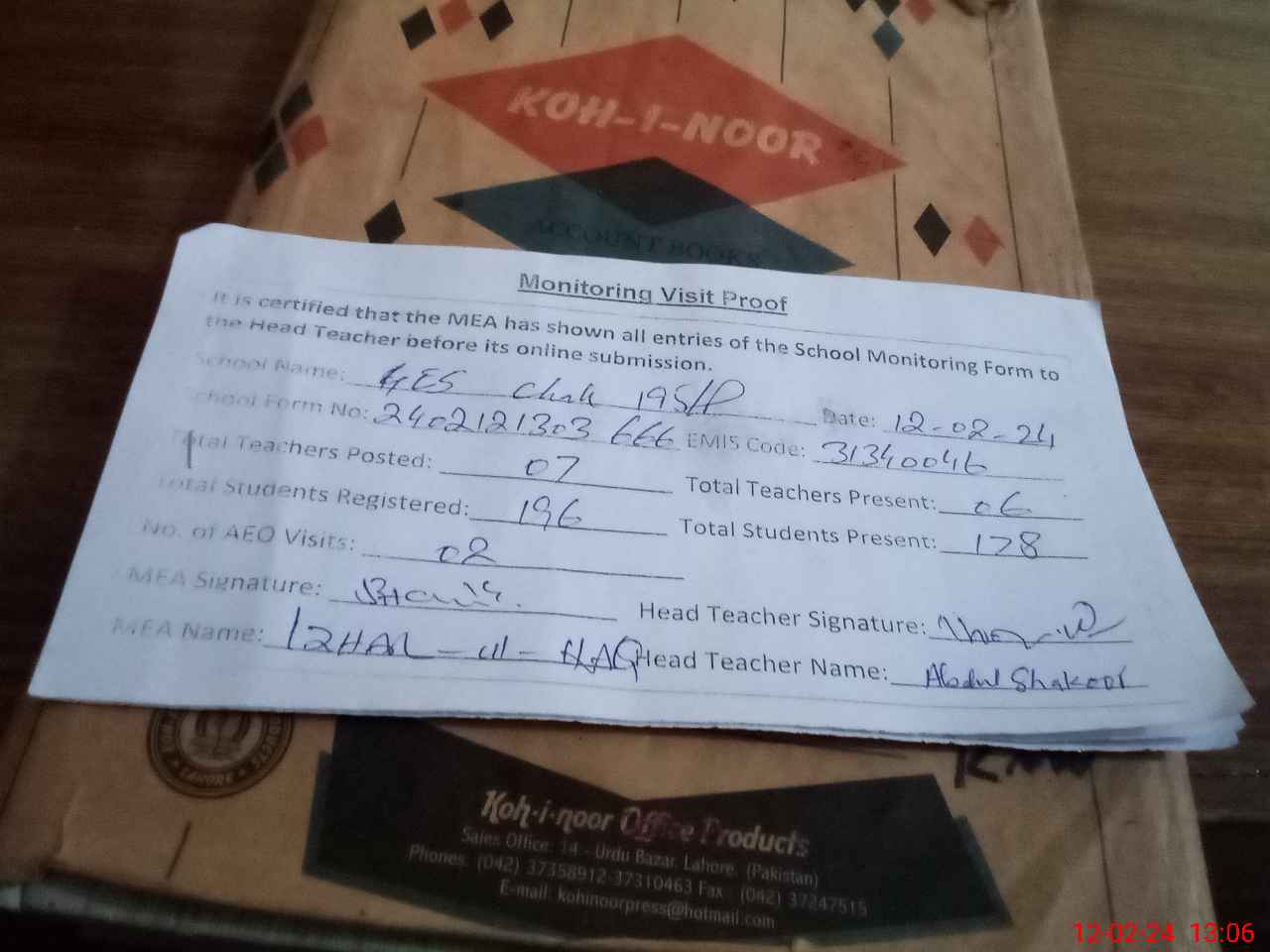 | Attendance Register | Head Teacher | MEA with School | Visit Proof |
