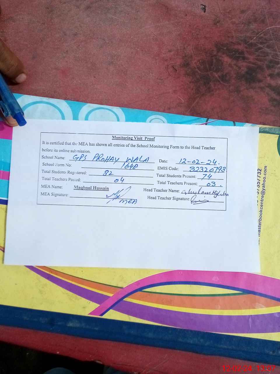 | EMIS Code: 32320793 | Name of School: GPS PROHAY WALA | |||