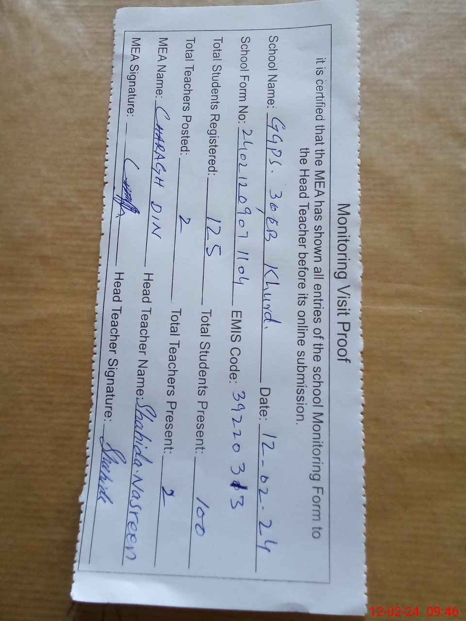 | EMIS Code: 39220313 | Name of School: GGPS CHAK 30/EB KHURD P/O 30/EB KALAN | |||