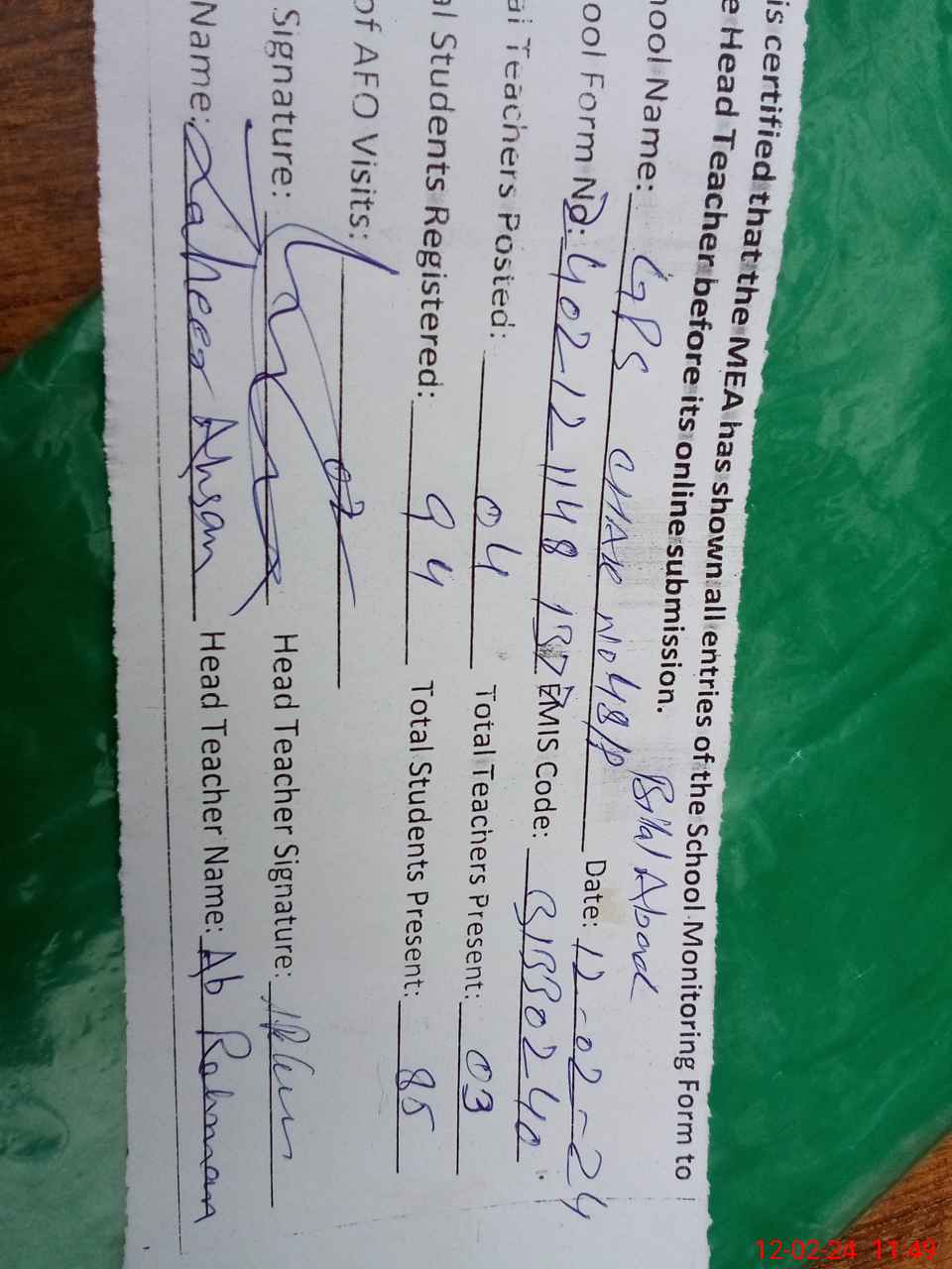 | Certified that this School was Inspected by the Undersigned MEA/DMO Today and the Information Stated Above is as Per Record. | |||||