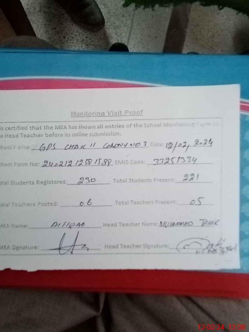| EMIS Code: 33251334 | Name of School: GPS CHAK 11 THAL COLONY NO 3 | |||