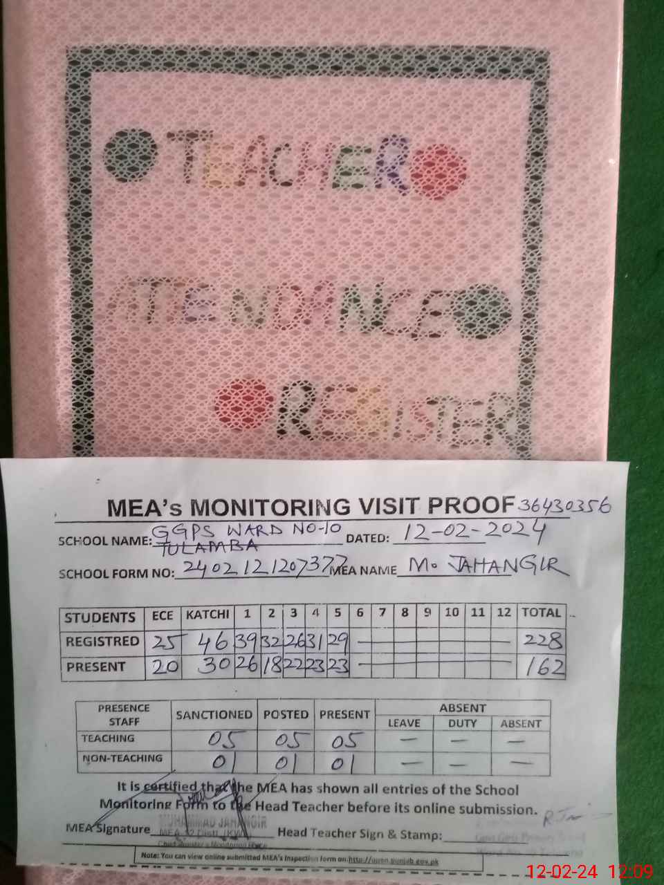 | Attendance Register | Head Teacher | MEA with School | Visit Proof |